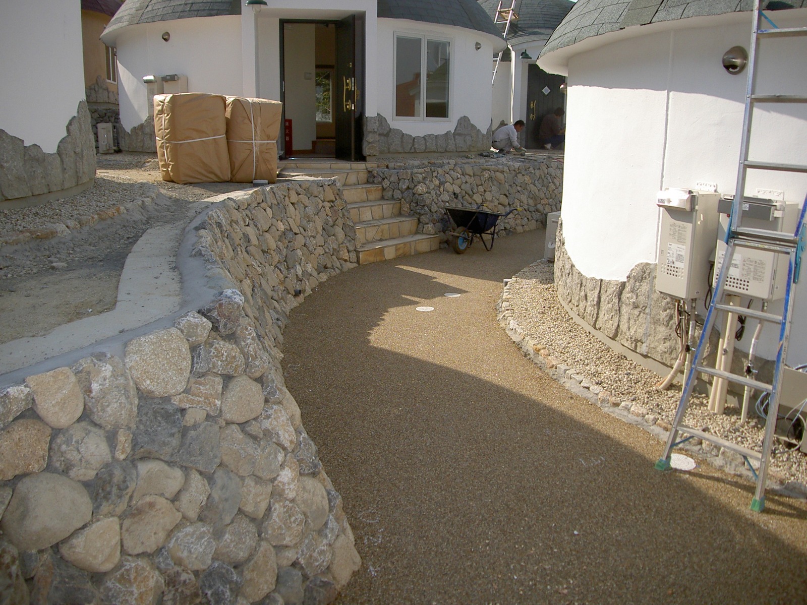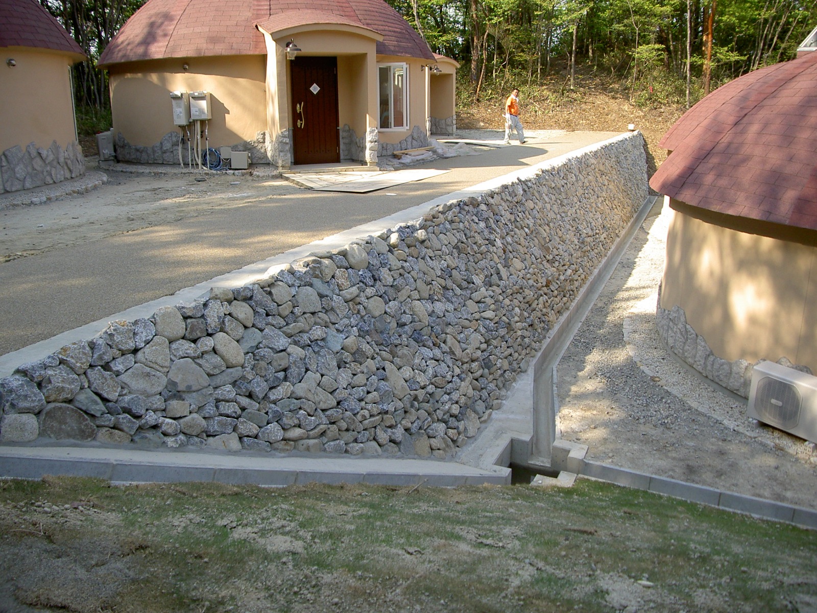 2005年5月、酪農をテーマとした商業施設様の法面工事をご依頼いただきました。施設のコンセプトに合わせ、斜面全体をヨーロッパ風の石積みで美しく仕上げています。景観と安全性の両立を実現した外構工事事例です。
